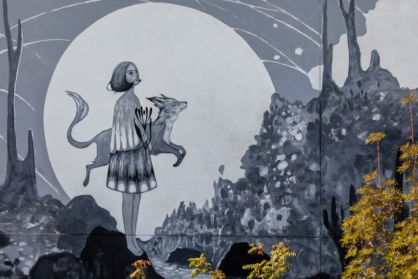 Amy Sol spent her childhood years in Korea then moved to Las Vegas, NV where she currently lives and works. Though the style of her work is greatly influenced by a combination of manga, folk-art, vintage illustration and modern design, she remains a self taught artist. She has dedicated many years of her life mixing pigments and mediums to achieve a unique color palette of subtly muted tones. The artist works intuitively from the beginning to end of each piece, with the intent that each painting’s theme or message can be interpreted subjectively. Within these delicate works, you may often find whimsical landscapes populated with exotic plants, animal and females… Amongst the expressions of each character are notions of peaceful reflection and a sense of companionship.