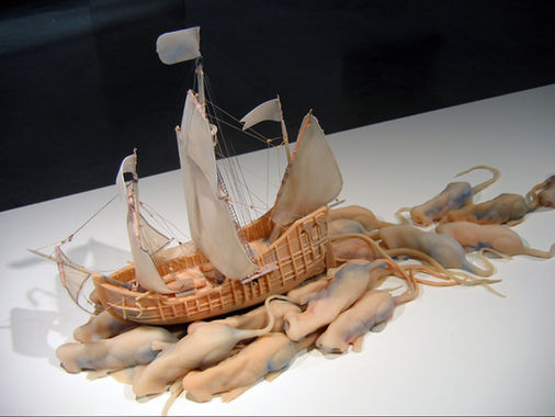 This sculpture is composed of a flesh tone replica of Columbus’s mother ship, the Santa Maria. The ship is floating on the backs of bio-morphed rodents with human noses in place of their heads. The work explore the sociological and political weight of ideology, similes of plague and invasive dogmas coexisting in a utopia that has gone wildly wrong.