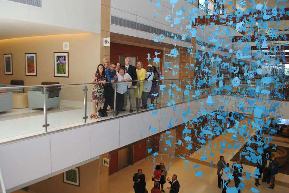 Drawing upon the stories of local Antelope Valley residents, artist and Antelope Valley native Brad Howe created the installation that now hangs in the atrium of the High Desert Regional Health Center, located on Avenue I and. Taking mental pictures from these stories, Howe turned them into actual images – 8,000 laser-cut aluminum plates painted blue. Spearheaded by the Lancaster Museum of Art and History, a naming contest took place with the winning name being “One Desert Sky” – an imagine invoked by the blue images and the stories behind them.